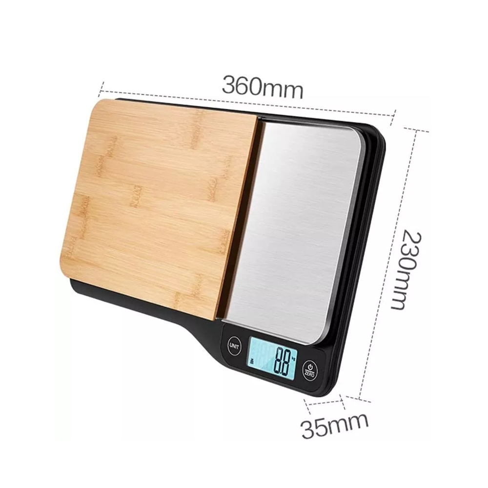 Product designation:Electronic kitchen scale Material:Bamboo, Plastic, Stainless Steel Product dimension: 30*20.5*3.45 cm Max capacity: 5kg / 11lb Division:1g / 0.1oz Measurement range:5g-5kg LCD display: 58x27mm Units:kg/lb Batteries: 2x1.5V AAA batteries (excluded ) Approval:CE/ROHS/LFGB Product Description ● With real bamboo cutting board ● With detachable stainless steel tray ● With white backlight ● High precision strain gauge sensor ● Indicate volume of water and milk ● Tare function;low battery/overload indicators Product designation |