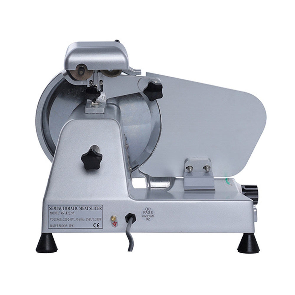 8' Semi-automatic meat slicer · Cut off the itinerary :150mm · Power: 210W , Input Voltage: 220V/50HZ · Blade Dia.: 220mm , Stainless steel material · Cutting thickness: 0~13mm · Package: 1pc/ctn